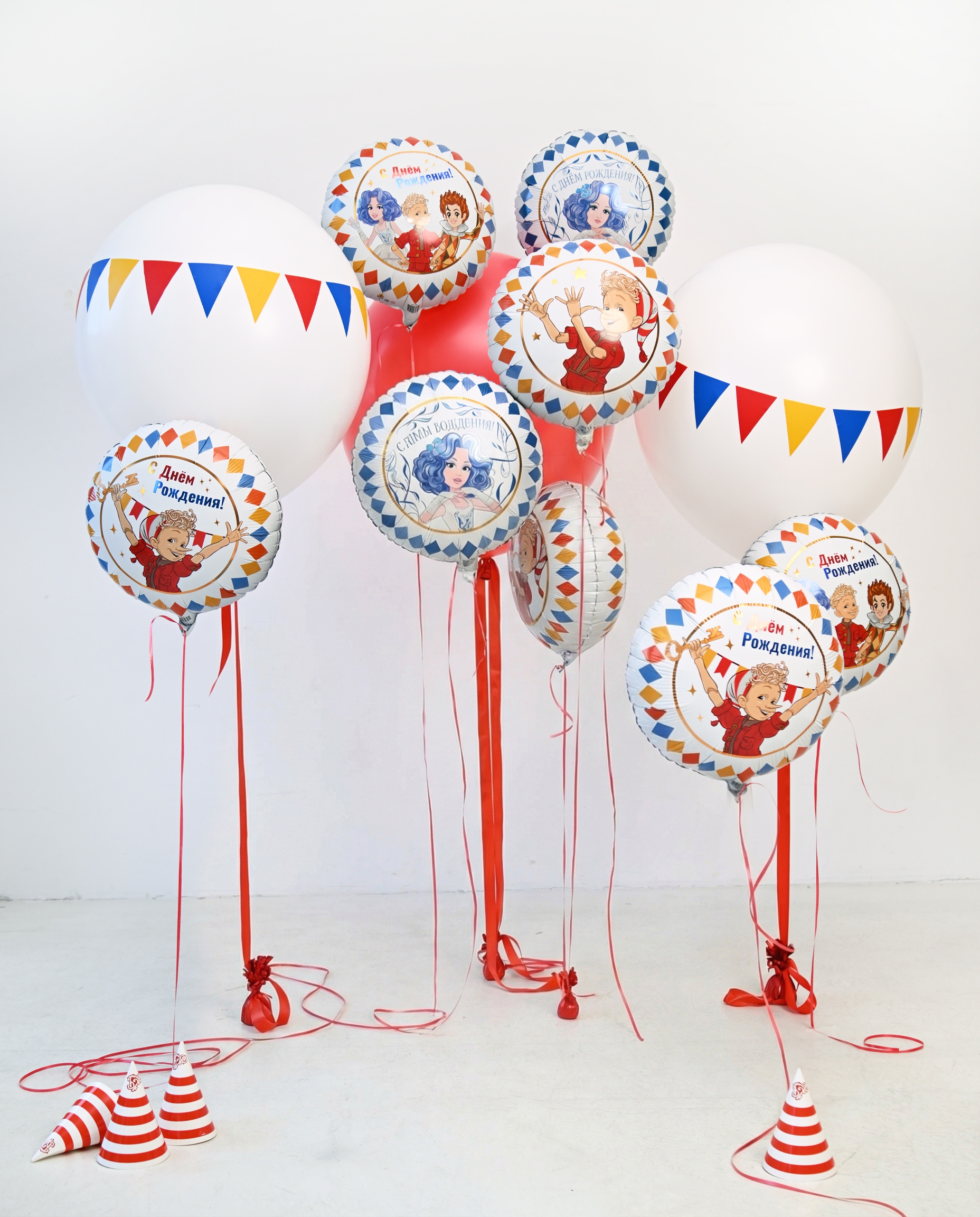 Эта яркая композиция из шаров — настоящий гимн радости и веселья! Крупные белые шары с весёлыми флажками задают бодрый ритм, а фольгированные шары с изображениями любимых героев и надписью «С Днём Рождения!» создают атмосферу настоящего праздника. Красные ленточки добавляют динамики и завершают образ. Такое оформление не оставит равнодушным ни одного гостя!