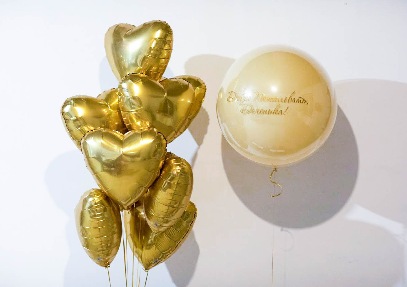 Эта изысканная композиция из воздушных шаров воплощение роскоши и нежности! Центральным элементом служит букет из блестящих золотых шаров в форме сердец. Их зеркальная поверхность переливается, словно солнечные лучи, создавая атмосферу праздника и тепла. Рядом парит элегантный полупрозрачный шар с трогательной гравировкой: «Добро пожаловать, доченька!». Золото и нежность объединились в этом декоре, чтобы подчеркнуть значимость и радость момента.