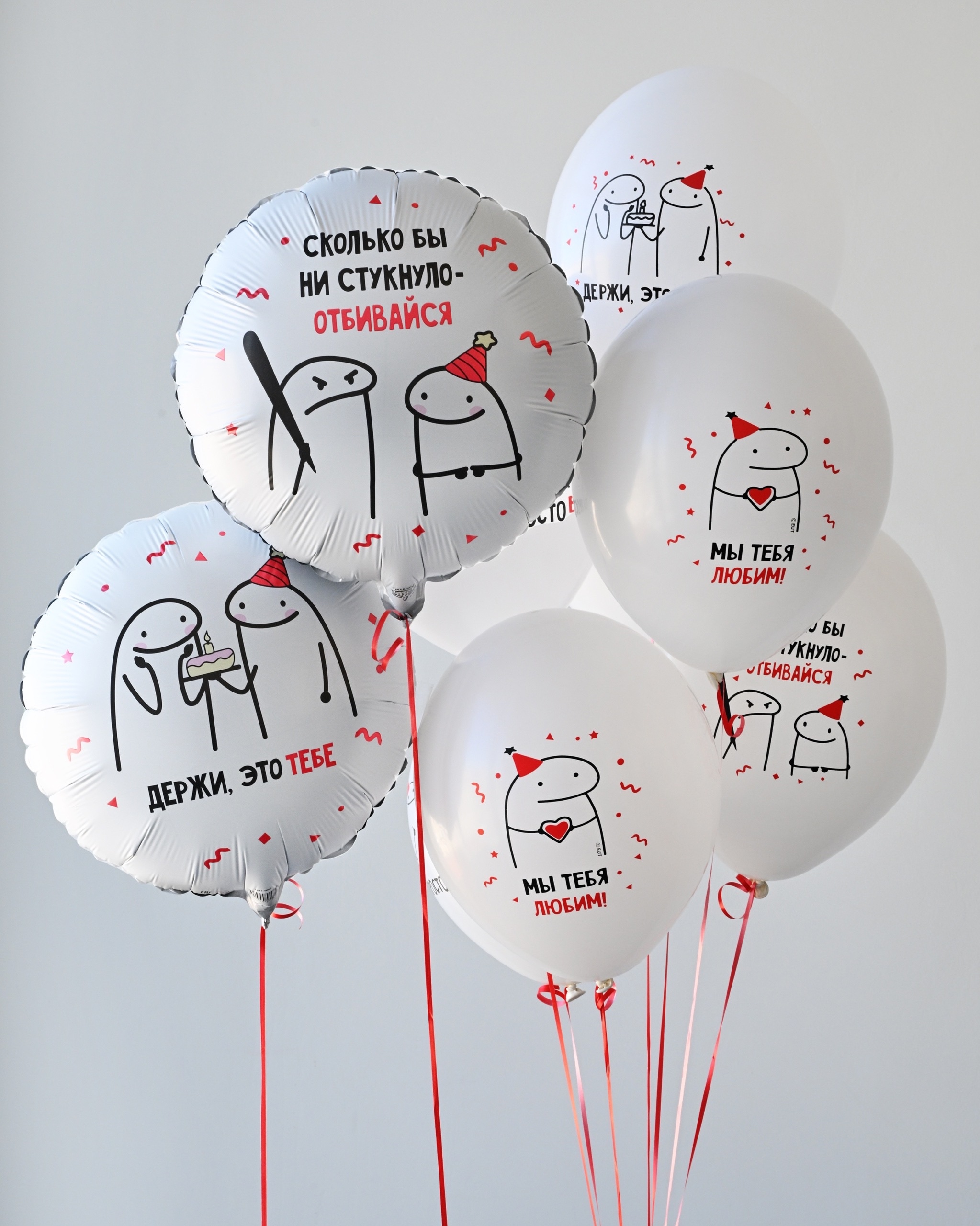 Эта озорная композиция из воздушных шаров — настоящий заряд позитива и хорошего настроения! Шесть белоснежных шаров украшены забавными рисунками человечков в праздничных колпаках и тёплыми, шутливыми надписями. Здесь и дружеский совет: «Сколько бы ни стукнуло — отбивайся!», и трогательное признание: «Мы тебя любим!», и щедрый жест: «Держи, это тебе!». Каждый шар — маленькое произведение юмора и заботы, создающее атмосферу весёлого праздника.