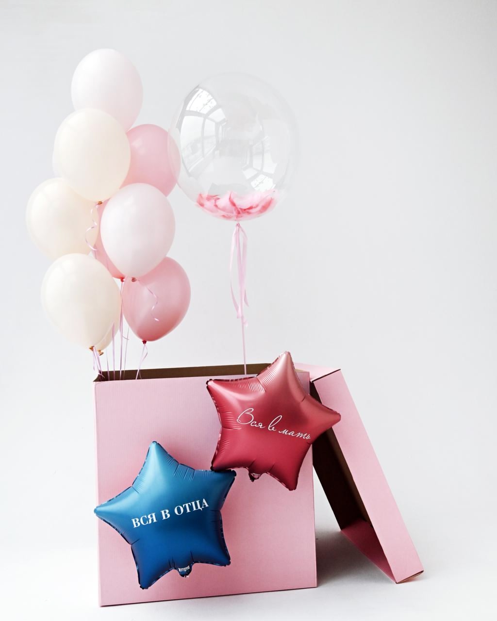 Эта изысканная композиция из шаров словно создана для самого трогательного момента — встречи с малышом! Нежные пастельные оттенки шаров — розовые и белые — создают атмосферу тепла и уюта, а прозрачный шар с розовыми лепестками внутри добавляет нотку волшебства. Особую изюминку композиции придают фольгированные звёзды с трогательными надписями: «Вся в мать» и «Вся в отца». Они не просто украшают оформление, а становятся символом семейной преемственности и любви. Такая композиция идеально дополнит праздник выписки из роддома или первый семейный праздник! 💖
