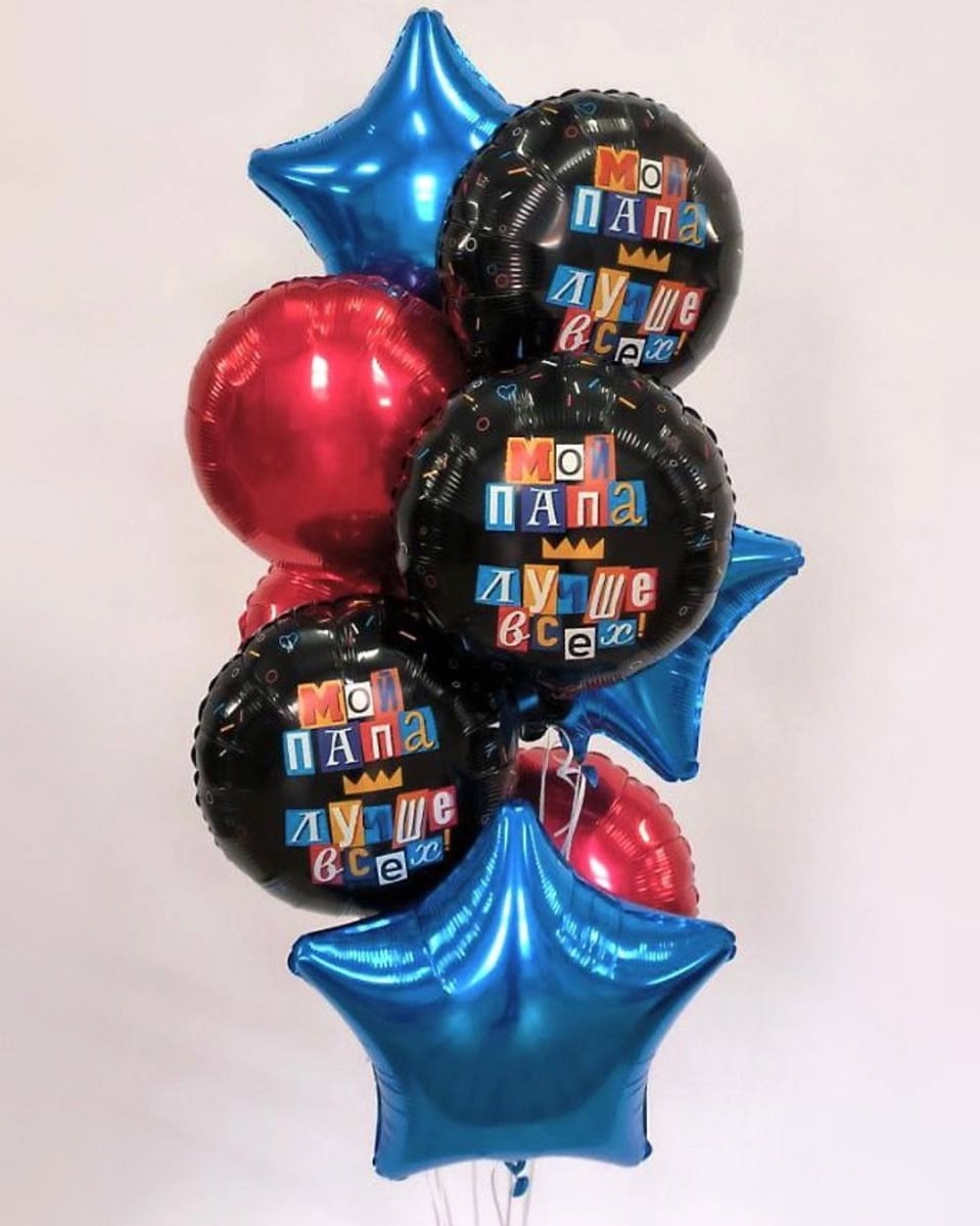 Эта яркая композиция из воздушных шаров настоящий гимн любви и уважения! Центральным мотивом стали чёрные шары с трогательной надписью «Мой папа лучше всех!» в весёлой, игровой стилистике. Их обрамляют сияющие синие звёзды и роскошный красный шар, создавая атмосферу праздника и гордости. Идеальный способ порадовать любимого папу в особый день! 💖