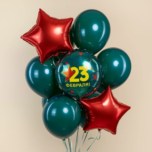 Круглые фольгированные шары тёмно-зелёного цвета (6–7 штук) — создают основной объём композиции, ассоциируются с военной тематикой (цвет формы, камуфляж). Их глянцевая поверхность придаёт блеск и торжественность.