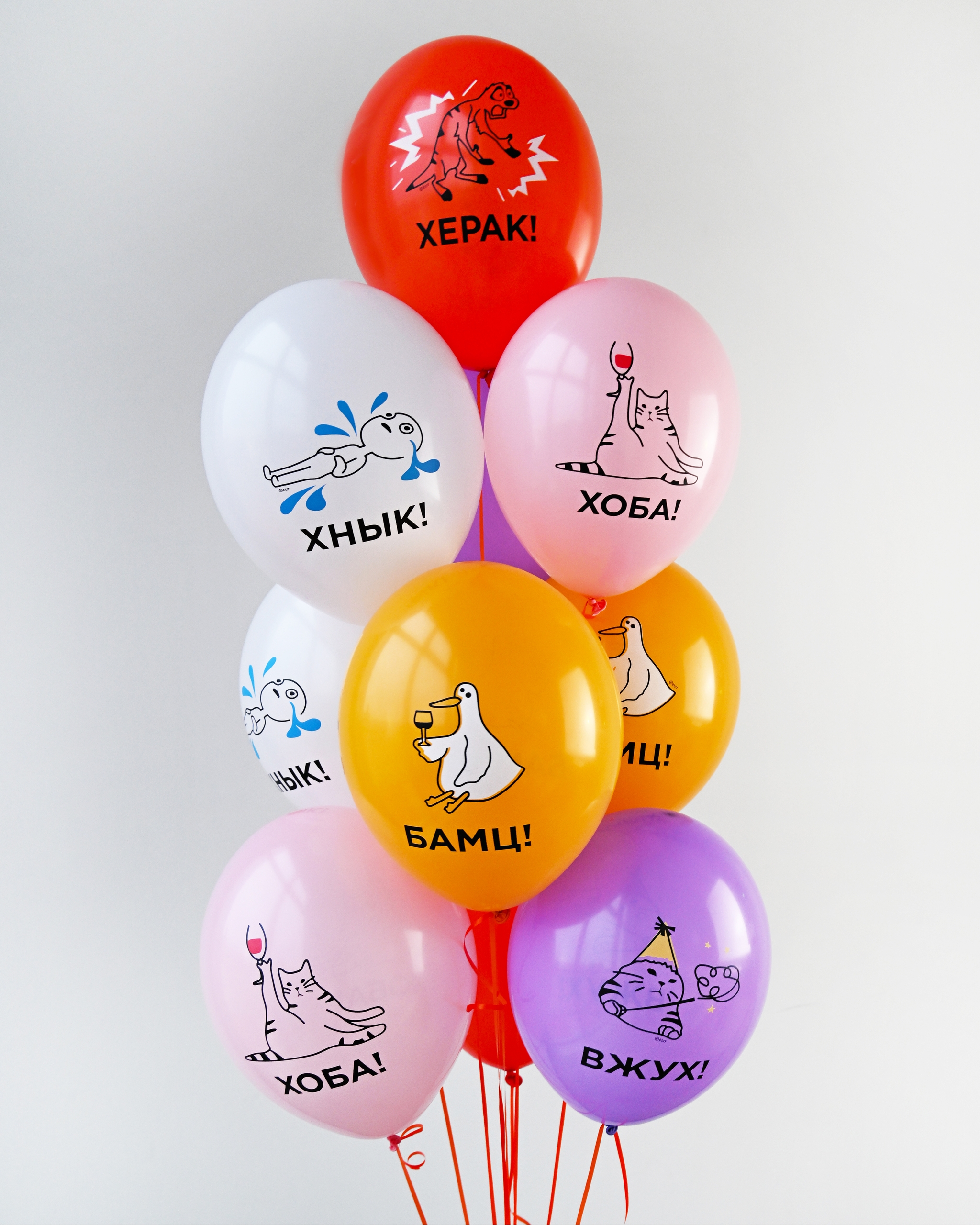 Взрыв эмоций в воздушных шарах! 🎉 Эта яркая коллекция латексных шаров настоящий концентрат юмора и позитива. Каждый шар мини-мем с забавным персонажем и остроумной надписью: «ХЕРАК!», «ХНЫК!», «ХОБА!», «БАМЦ!», «ВЖУХ!» и другие. Сочные оттенки от ярко-оранжевого до нежно-розового создают атмосферу безудержного веселья. Идеальный декор для смелого праздника!