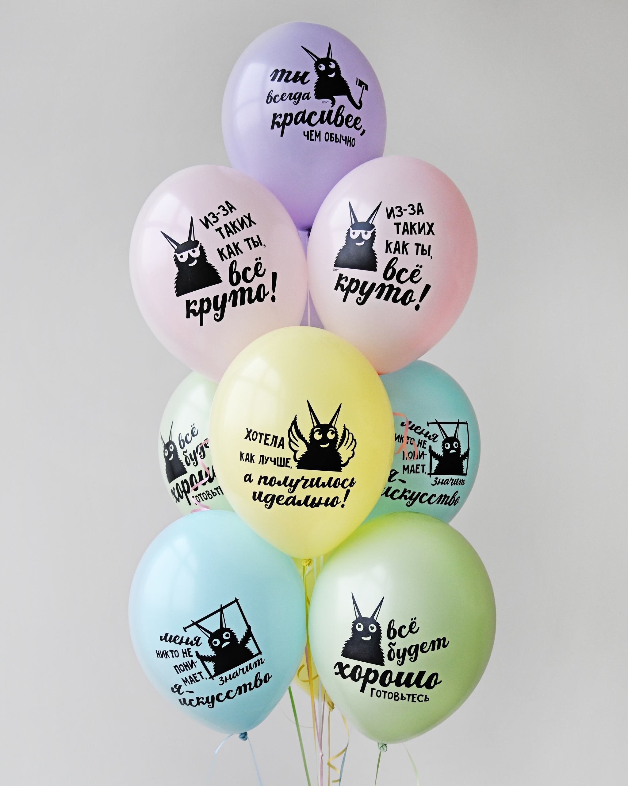 ✨ Взрыв позитива в воздушных шарах! 🎉 Эта яркая композиция — не просто декор, а порция добрых шуток и тёплых пожеланий. На нежных пастельных шарах — остроумные фразы и забавные персонажи, которые точно поднимут настроение!