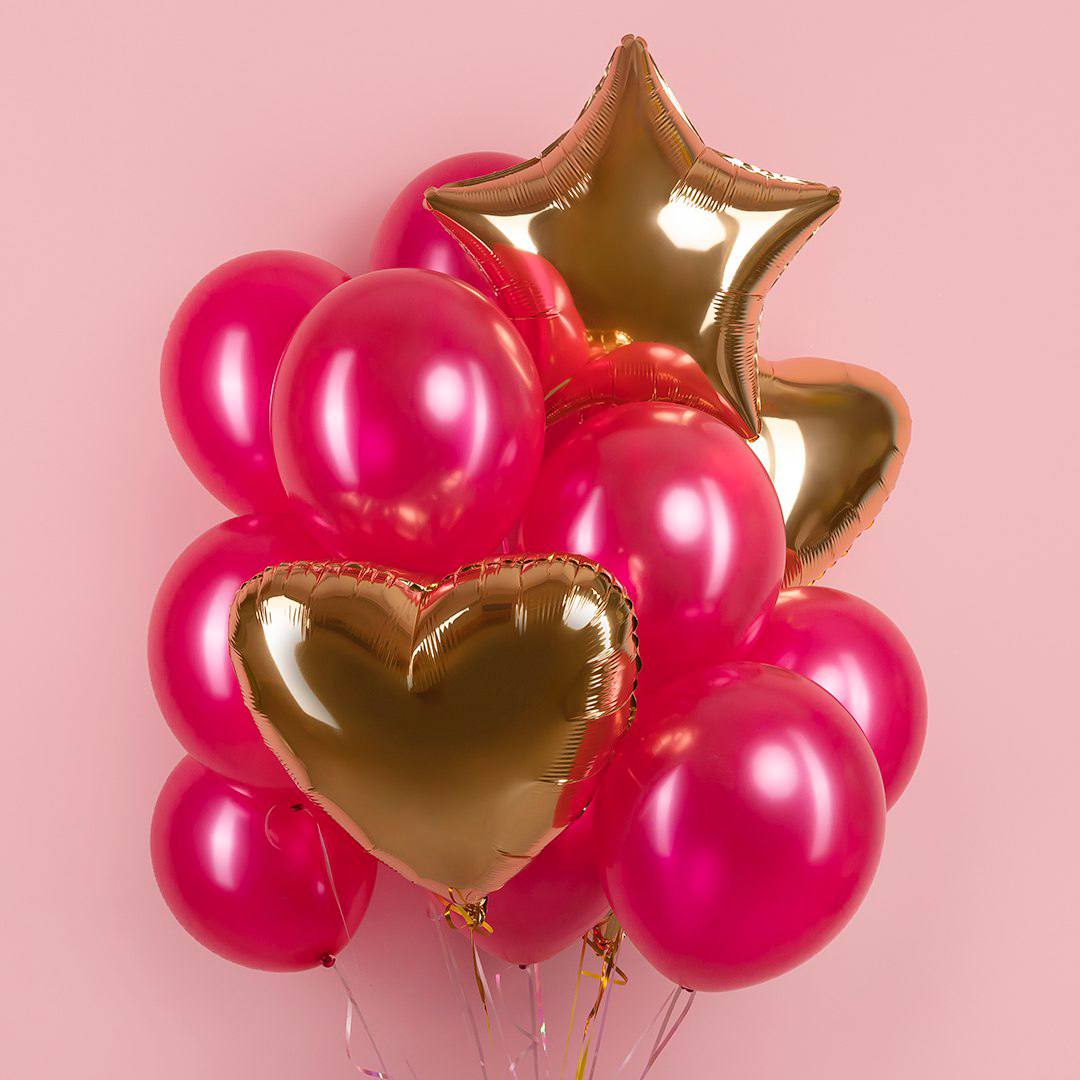 Эта роскошная композиция из воздушных шаров — воплощение праздника и элегантности! Центром композиции стали изысканные фольгированные шары античного золота в форме сердца и звезды. Их благородный блеск гармонично сочетается с россыпью ярких малиновых шаров, создающих эффект пышного облака. Золотистые элементы словно сияют на фоне насыщенных оттенков, придавая ансамблю королевскую утончённость. Такая композиция станет главным украшением любого торжества — от дня рождения до романтического вечера.